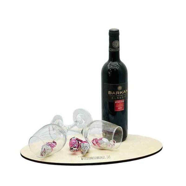 מגש ליין כולל בקבוק יין ושני כוסות אפשרות להגדשה אישית במידות 40 ס"מ על 20 ס"מ מגיע ארוז בצלופן כולל סרט