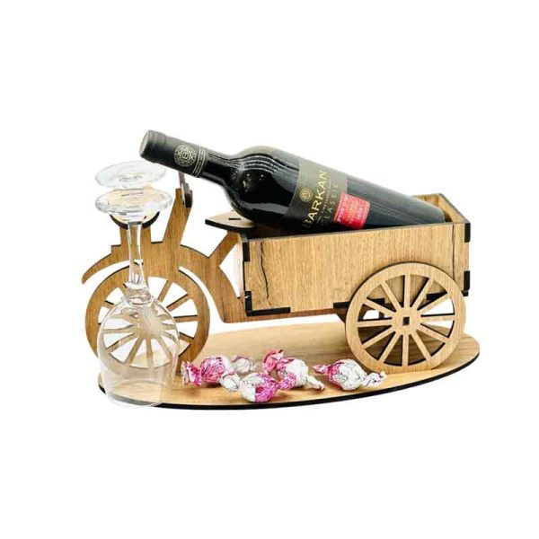 מתקן יין בצורת תלת אופן כולל בקבוק יין בארגז כולל 2 כוסות גודל המתקן 40/20 ס"מ עובי 6 מ"מ מוצר